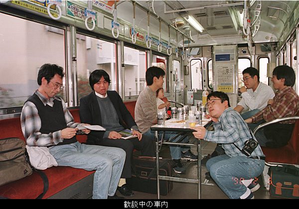 今回は現役新入生歓迎会も兼ねているため現役学生も4名参加し、OB12名と合わせて16名の盛況?となりました。車両は351形の354号です。予定通り14:30に天王寺駅前を発車し、一路浜寺駅前へ。ビールで乾杯して盛り上がり?ながら、まずは新入生の挨拶です。その後近況報告なんかをしようと思ったのですが、ワイヤレスマイクの調子が悪く、かといって走行中の肉声はちょっとツラいので、結局適当に歓談する状態になりました。