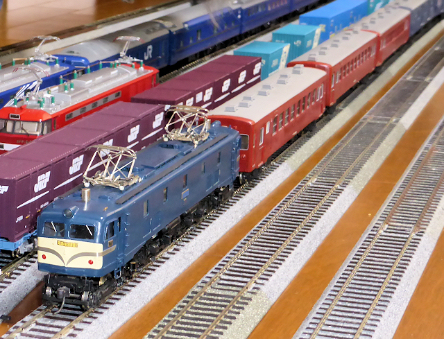 2018年度の鉄道模型運転会は5月に、定例通り会員の自宅にて開催されました。 10時過ぎより集まりだして、開通式・記念撮影、昼食といつもどおりの日程で始まりました。 今回の線路は16.5mm複線エンドレスと13mm単線エンドレスの2種類です。 浅川氏の車輛 OB会車輛 右側はJM EF58と50系客車 EF64牽引で14系と12系の12連 C58の品評会 左 宮沢製 右 トビー製